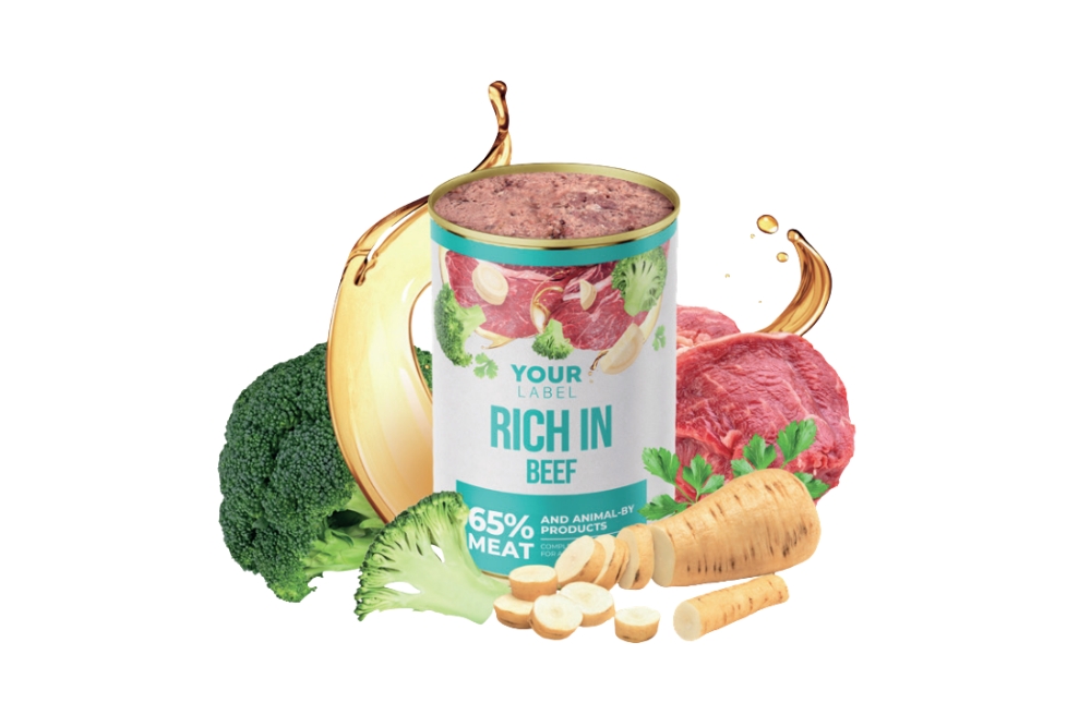 Composition: meat and animal-by products 65 % (including beef 14 %), meat broth 28 %, broccoli 2 %, parsley root 2 %, minerals, oils and fats (including salmon oil 0.5 %)