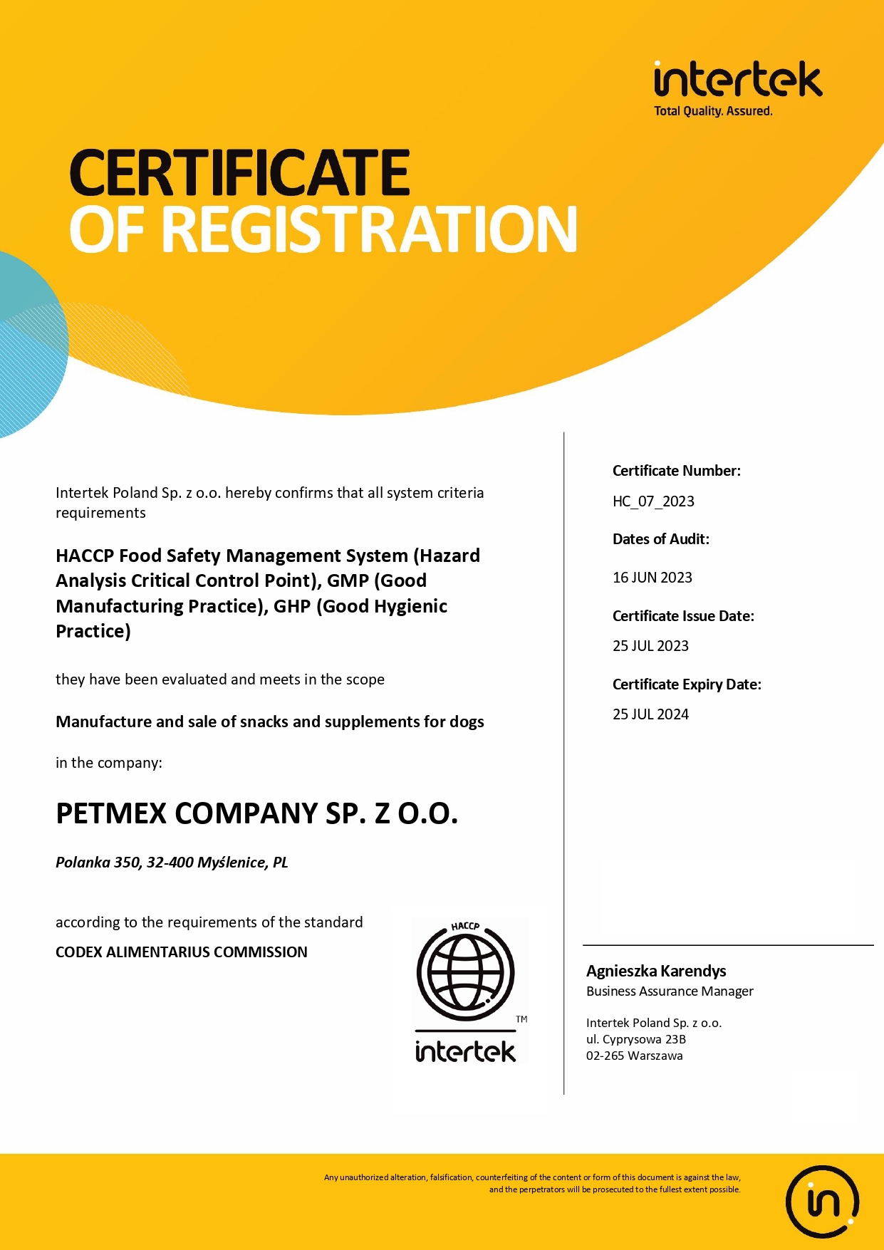 Firma Intertek Poland przyznała certyfikację HACCP, GMP i GHP firmie Petmex. To potwierdzenie, że wdrożone w przedsiębiorstwie systemy jakości i bezpieczeństwa żywności działają zgodnie z przyjętymi normami.