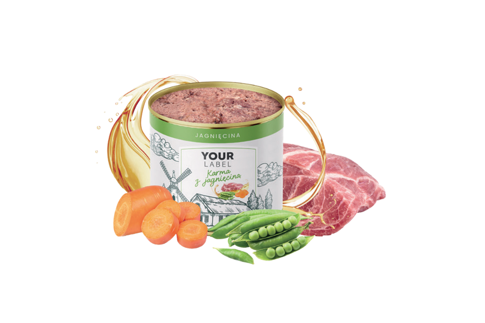 Skład: mięso i produkty pochodzenia zwierzęcego 65 % (w tym jagnięcina 4 %), bulion mięsny 27,5 %, groszek 2 %, marchewka 2 %, minerały, oleje i tłuszcze (w tym olej z łososia 0,5 %). siarczan chondroityny, siarczan glukozaminy.