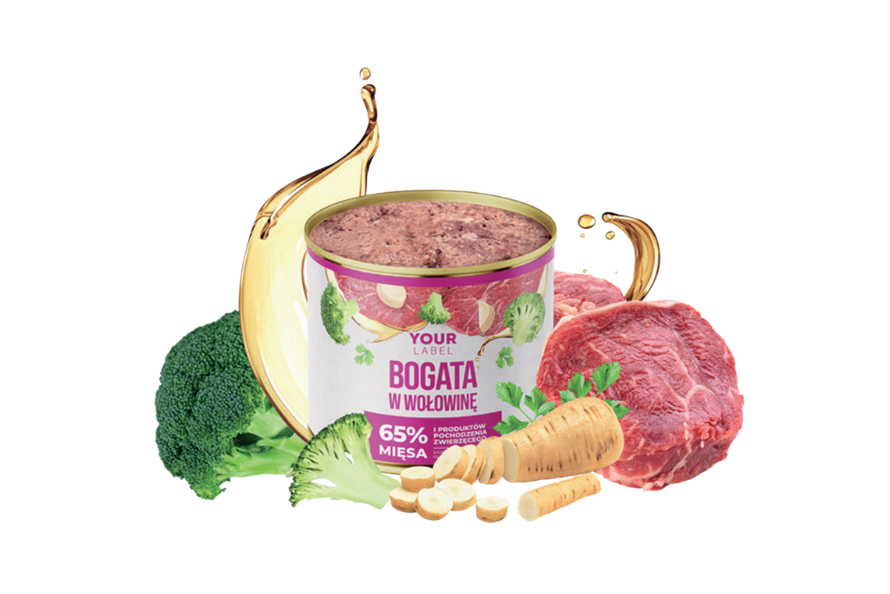 Skład: mięso i produkty pochodzenia zwierzęcego 65 % (w tym wołowina 14 %), bulion mięsny 28 %, brokuł 2 %, pietruszka 2 %, minerały, oleje i tłuszcze (w tym olej z łososia 0,5 %).