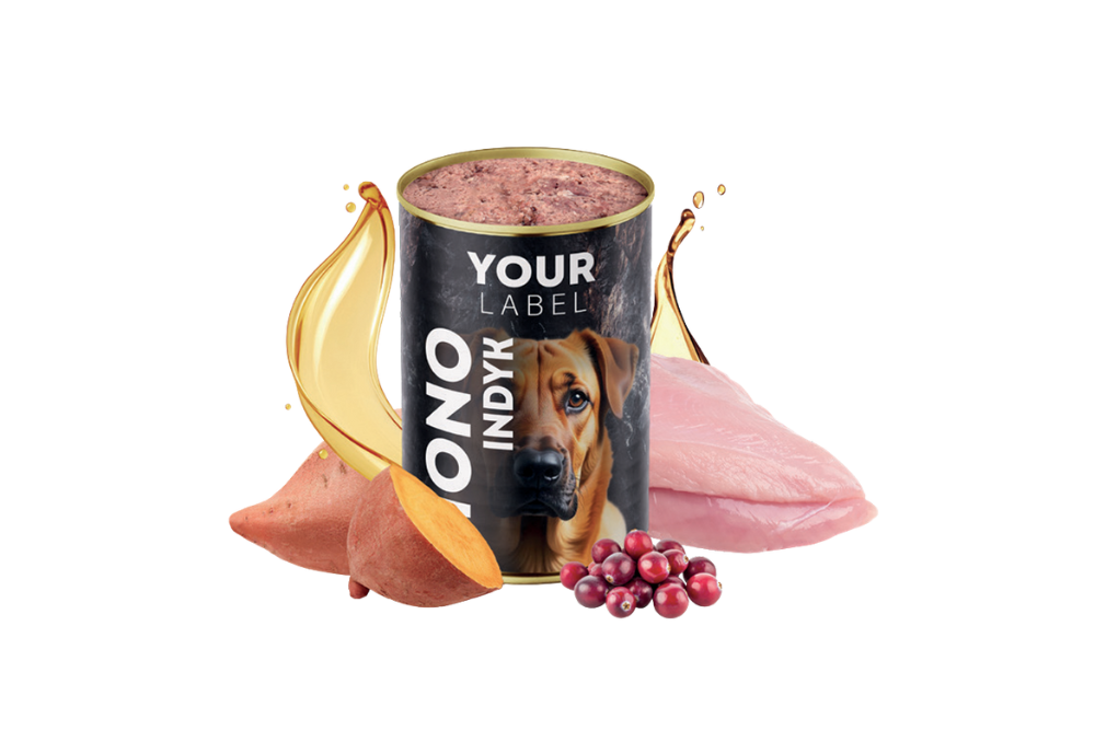 Skład: indyk 65 %, bulion mięsny 28 %, bataty 2 %, żurawina 2 %, minerały, oleje i tłuszcze (w tym olej z łososia 0,5 %).