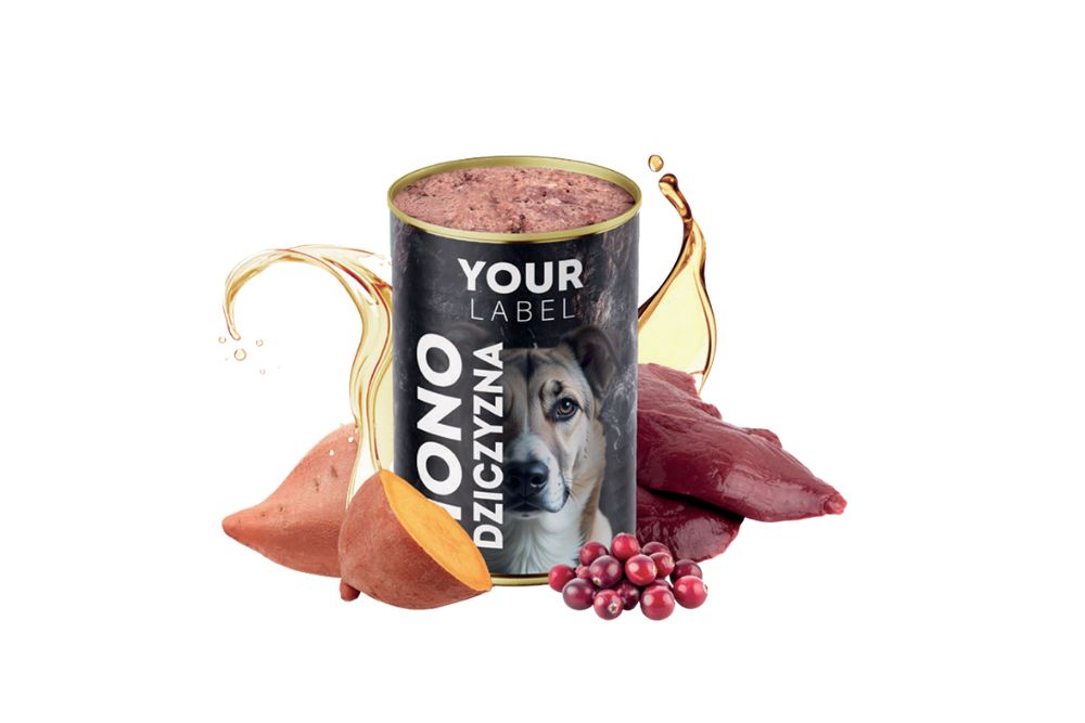 Skład: dziczyzna 65 %, bulion mięsny 28 %, bataty 2 %, żurawina 2 %, minerały, oleje i tłuszcze (w tym olej z łososia 0,5 %).