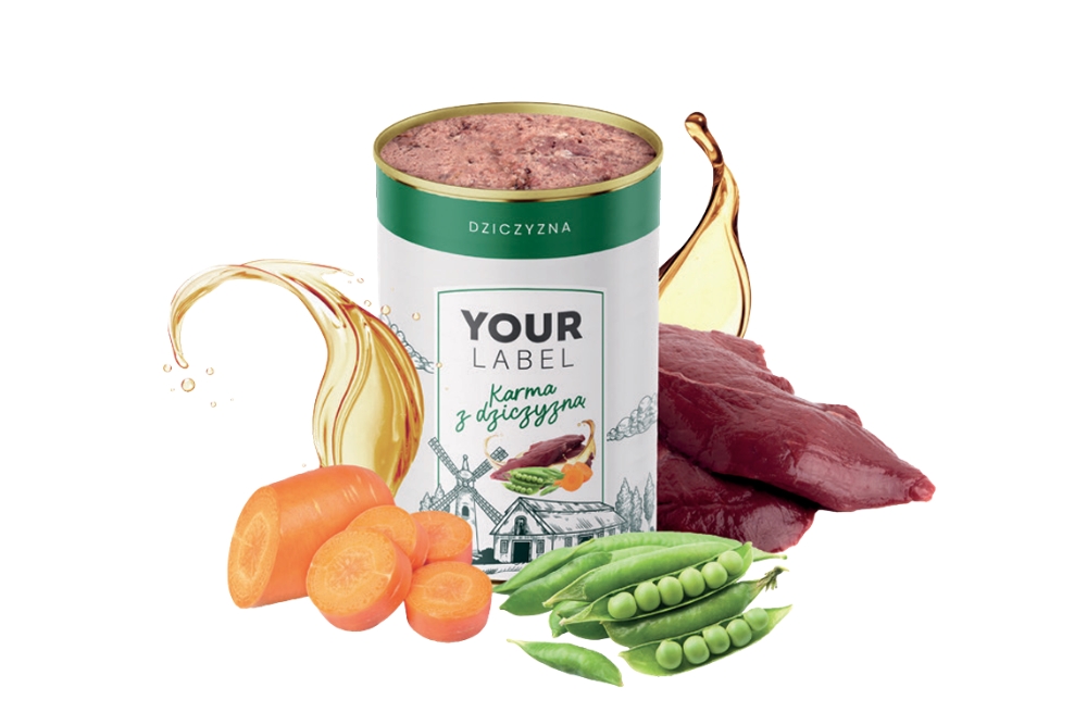 Skład: mięso i produkty pochodzenia zwierzęcego 65 % (w tym dziczyzna 4 %), bulion mięsny 27,5 %, groszek 2 %, marchewka 2 %, minerały, oleje i tłuszcze (w tym olej z łososia 0,5 %).