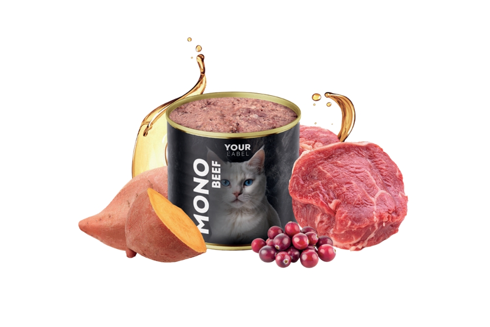 Composition: beef 65 %, meat broth 28 %, cranberries 2 %, sweet potatoes 2 %, minerals, oils and fats (including salmon oil 0.5 %)