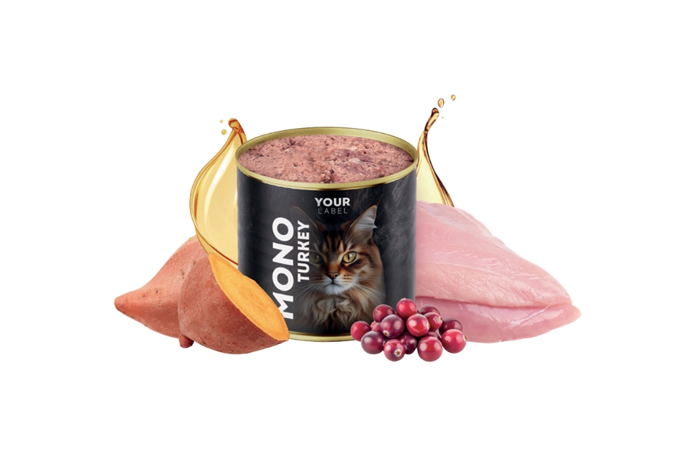 Composition: turkey 65 %, meat broth 28 %, cranberries 2 %, sweet potatoes 2 %, minerals, oils and fats (including salmon oil 0.5 %)