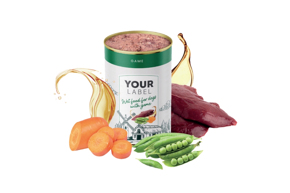 Composition: meat and animal-by products 65 % (including game 4 %), meat broth 27,5 %, carrots 2 %, green peas 2 %, minerals, oils and fats (including salmon oil 0.5 %)