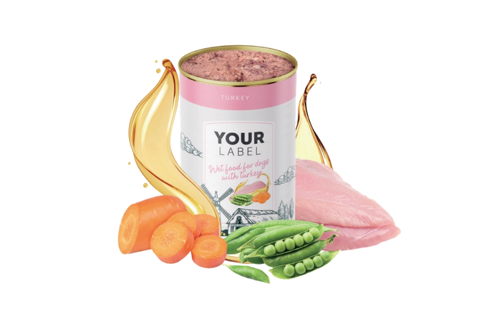 Composition: meat and animal-by products 65 % (including turkey 4 %), meat broth 27,5 %, carrots 2 %, green peas 2 %, minerals, oils and fats (including salmon oil 0.5 %).