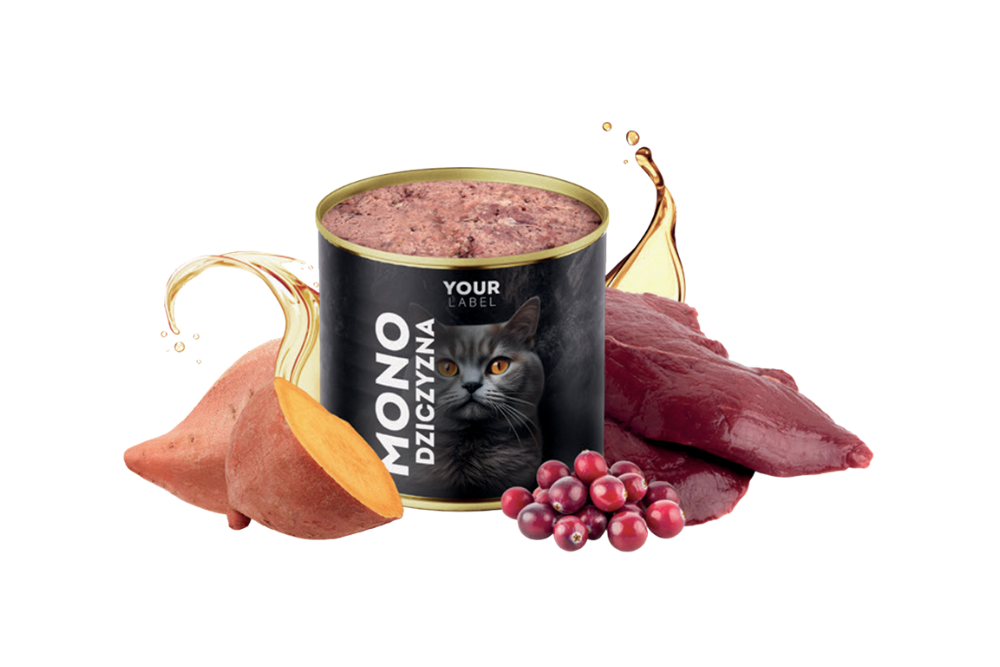 Skład: dziczyzna 65 %, bulion mięsny 28 %, bataty 2 %, żurawina 2 %, minerały, oleje i tłuszcze (w tym olej z łososia 0,5 %).