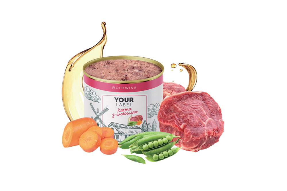 Skład: mięso i produkty pochodzenia zwierzęcego 65 % (w tym wołowina 4 %), bulion mięsny 27,5 %, groszek 2 %, marchewka 2 %, minerały, oleje i tłuszcze (w tym olej z łososia 0,5 %).