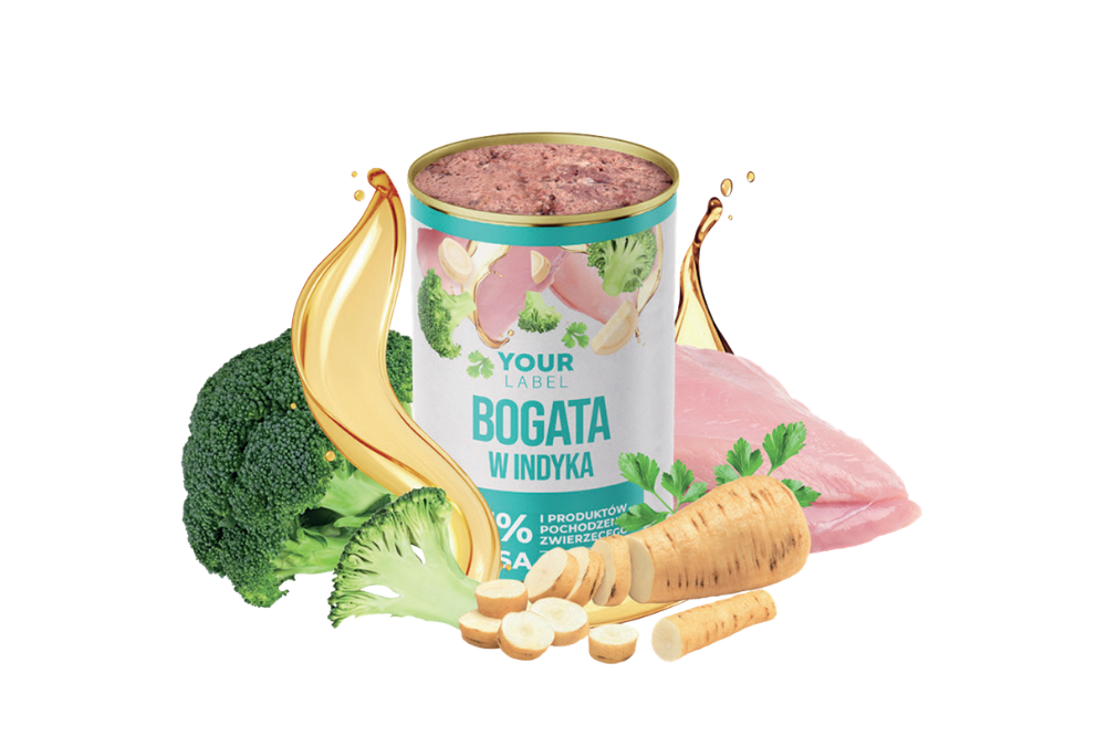 Skład: mięso i produkty pochodzenia zwierzęcego 65 % (w tym indyk 14 %), bulion mięsny 28 %, brokuł 2 %, pietruszka 2 %, minerały, oleje i tłuszcze (w tym olej z łososia 0,5 %).