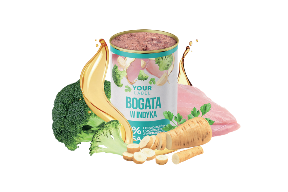 Skład: mięso i produkty pochodzenia zwierzęcego 65 % (w tym indyk 14 %), bulion mięsny 28 %, brokuł 2 %, pietruszka 2 %, minerały, oleje i tłuszcze (w tym olej z łososia 0,5 %), siarczan chondroityny, siarczan glukozaminy.